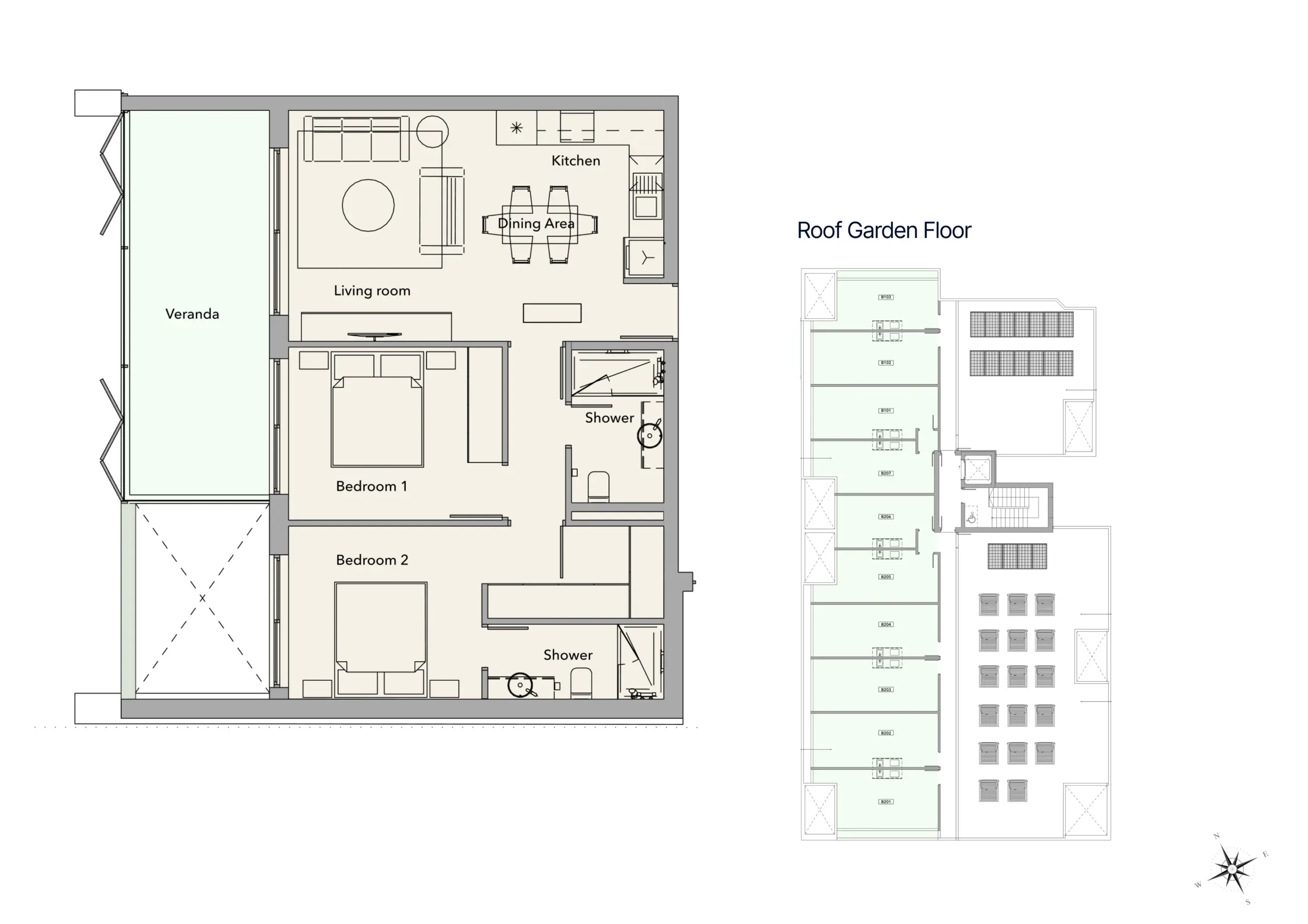B101 — 2 Bedrooms, Garden View & Roof Garden