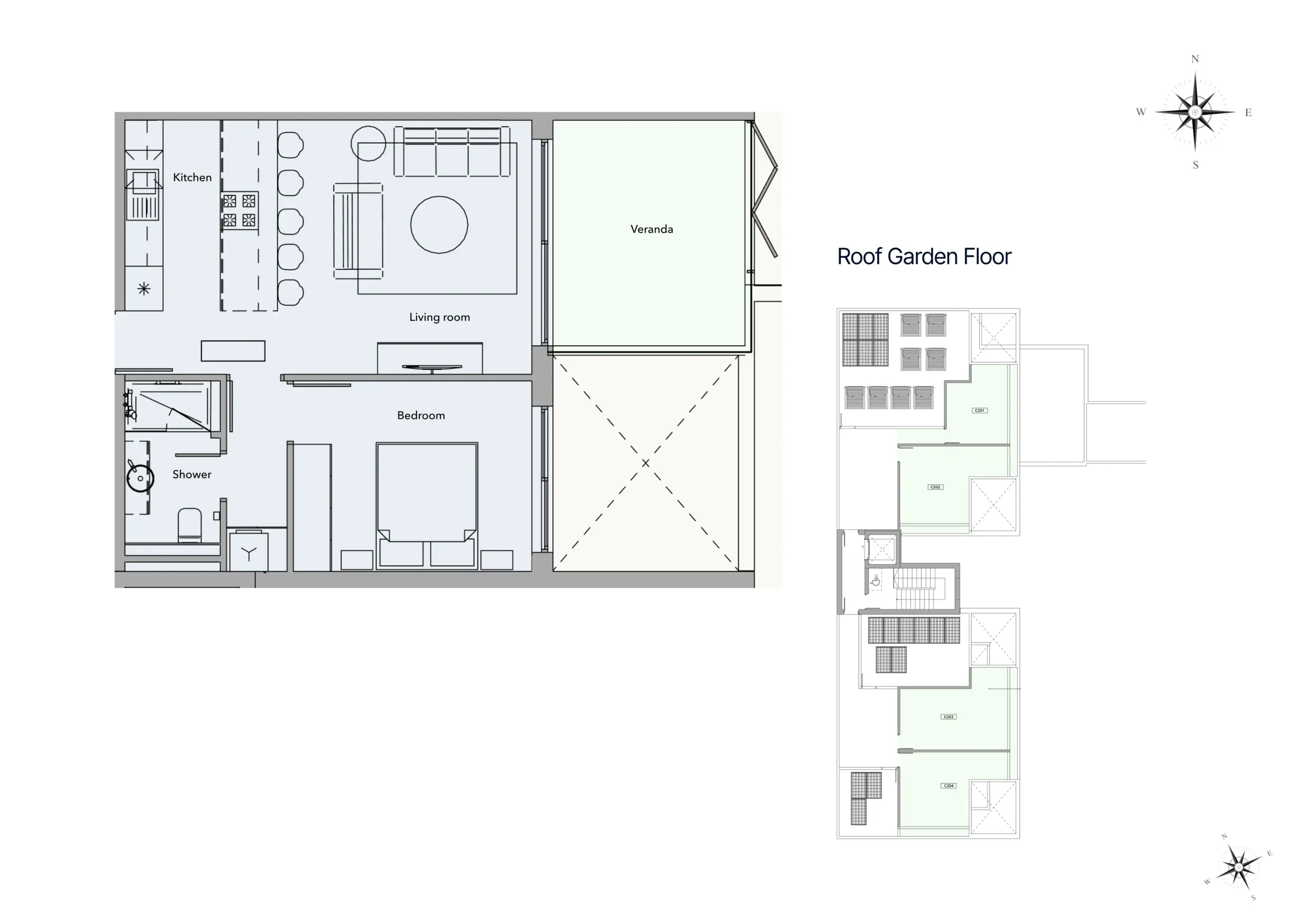 C202 is a standout one-bedroom residence distinguished by an exceptionally large 31.5 m² private roof garden. The 51.7 m² interior is both modern and welcoming, designed with proportions that feel open and calming. Its 12.1 m² veranda offers beautiful views, reinforcing the apartment’s serene atmosphere.