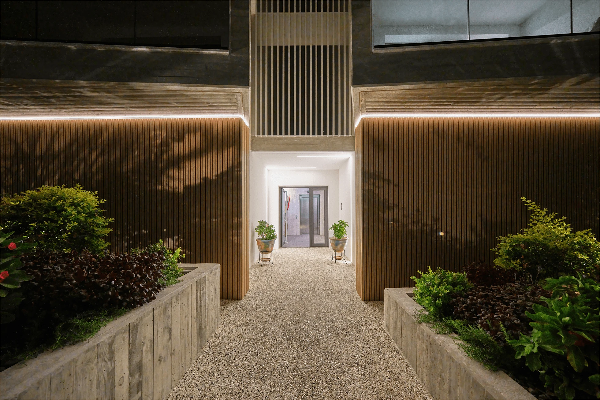 Modern aest hetic combining exposed concrete and white paint on all four elevations