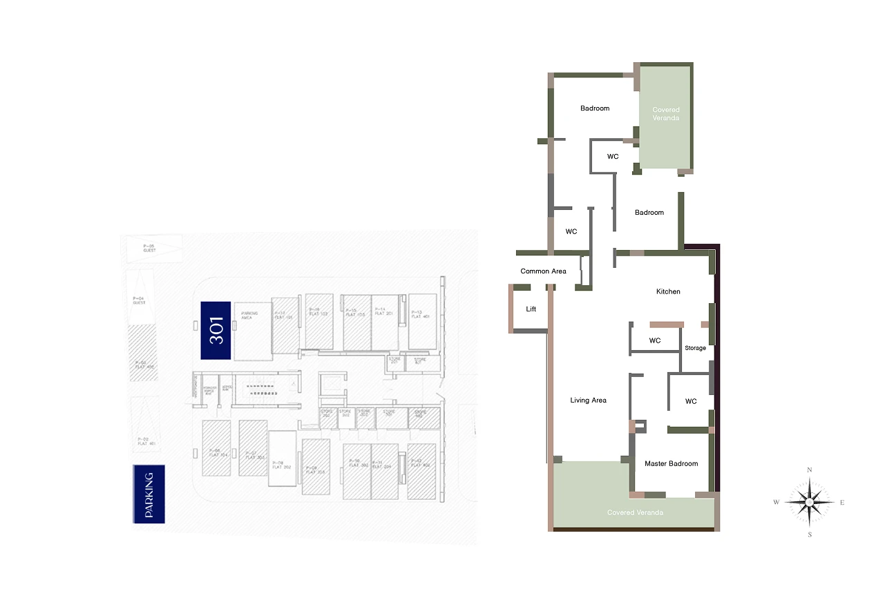 Apartment consists of spacious living room with covered main veranda, kitchen with laundry/storage room, a guest WC, 2 bedrooms with en-suite showers, and master bedroom with en-suite bathroom.
